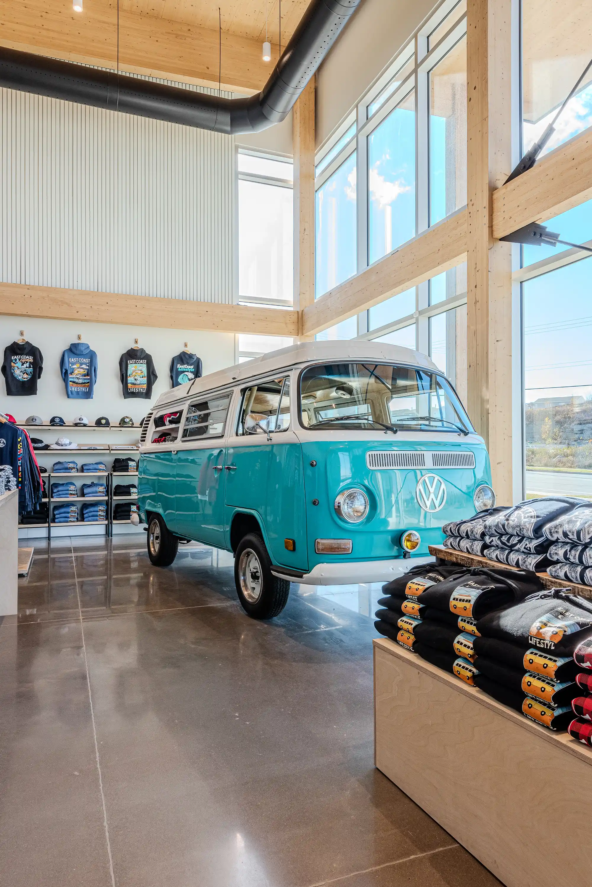 We kept the design honest and simple, letting the structure lead while layering in modern details. All retail fixtures were custom-designed and built locally using Maritime lumber, keeping the space connected to the community behind the brand. The result is a fresh, functional HQ that feels true to the East Coast Lifestyle brand.