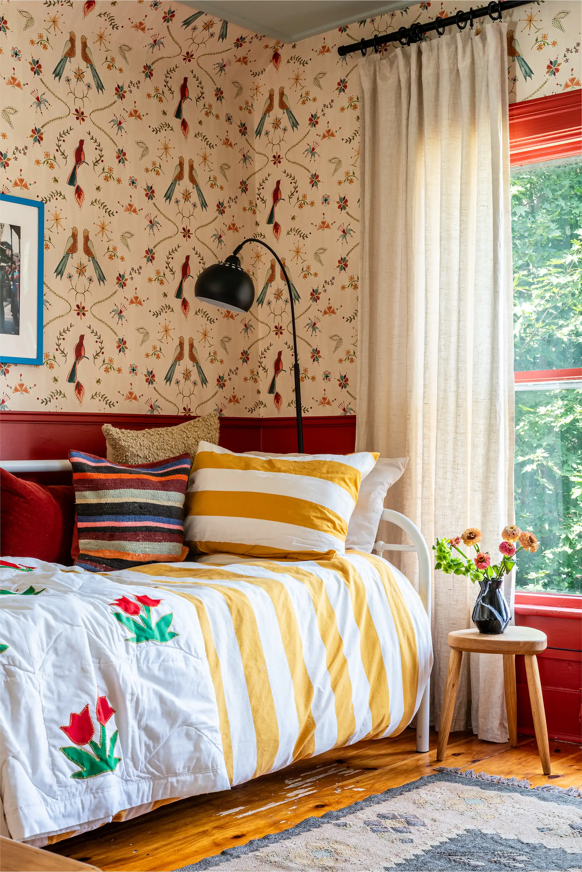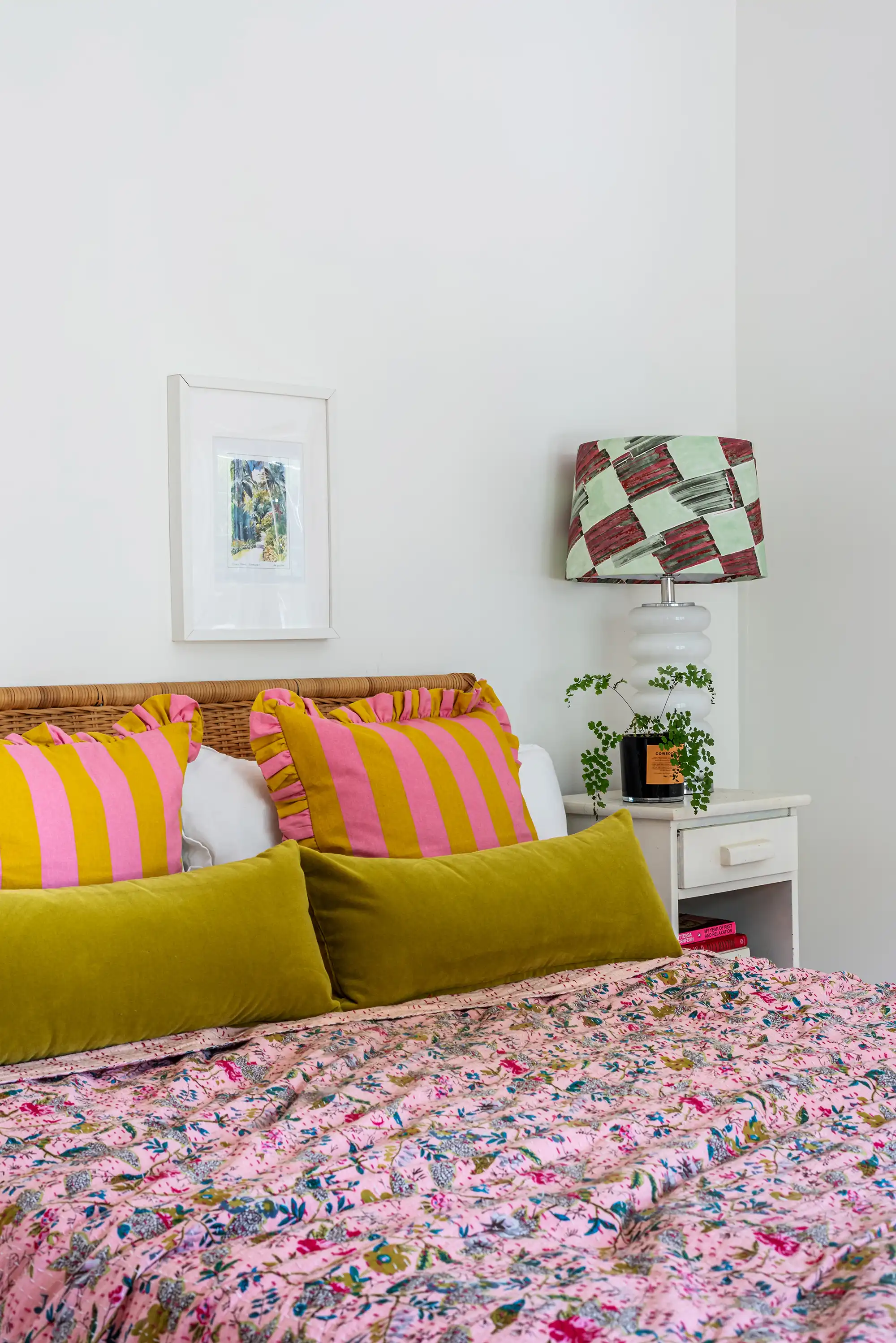 Throughout the living spaces and bedrooms, Robyn’s love of colour and pattern comes through in layered textiles, lively palettes, and collected details. These rooms set the tone for the home—warm, personal, and joyfully expressive—and informed the bold choices made in both bathrooms.